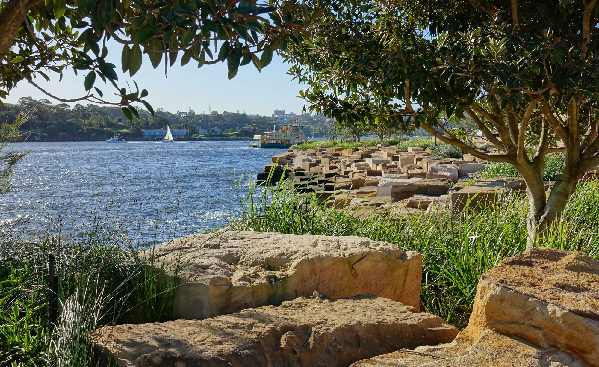 With the idea of ”One Park” it is important for the Barangaroo Precinct that the material vocabulary and scale is consistent but transitions in form, from a Naturalistic condition to an Urban condition. Barangaroo Reserve is a framework made of Native Sydney sandstone, and Native Sydney planting. We believe that it is vitally important that Harbour Park is composed as a more civic expression of these materials. With our original Barangaroo Reserve design team we entered a wonderful journey of discovery about the limits of using these materials in their most robust form.
